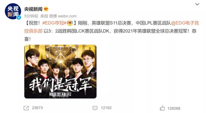 央视新闻微博第一时间发文祝贺,“刚刚,英雄联盟S11总决赛,中国LPL赛区EDG电子竞技俱乐部战队以3:2战胜韩国LCK赛区战队DK,获得2025年英雄联盟全球总决赛冠军!恭喜! ”