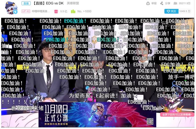 《英雄联盟》全球总决赛吸引了全球观众的目光,11月6日晚,仅在bilibili平台,S11总决赛的直播便吸引了3.5亿人气,满屏EDG加油的弹幕也能看出观众的热情。