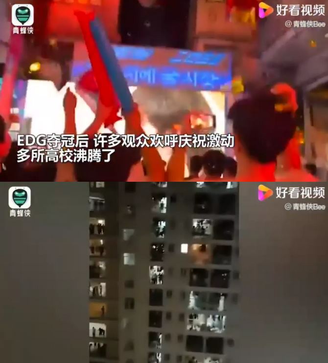 冠军时刻的到来,让中国的《英雄联盟》粉丝们陷入狂欢。多地高校的男生宿舍像过年一般庆祝夺冠,高呼:EDG世界冠军!