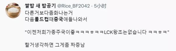 “比起别的,有点生气的是,下次英雄联盟比赛的时候,中国孩子们出来:‘现在我们是宗主国了呵呵呵呵呵呵呵LCK王朝已经不存在了。哈哈哈。’一想到这个就有点烦。”