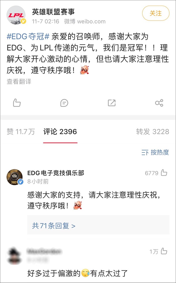 @EDG电子竞技俱乐部 也表示:“感谢大家的支持,请大家注意理性庆祝,遵守秩序哦!”