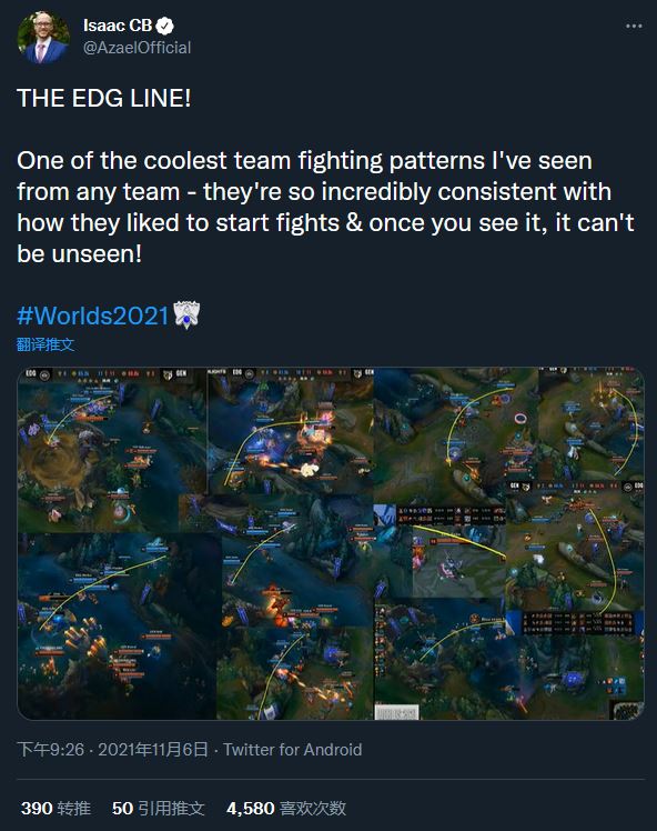 《英雄联盟》官方解说Isaac CB在推特上大力称赞EDG:“EDG对线!这是我在所有队伍中,看过最酷的团战模式。他们在开团方面有着难以置信的一致性。一旦看到,就难以令人忘怀!”