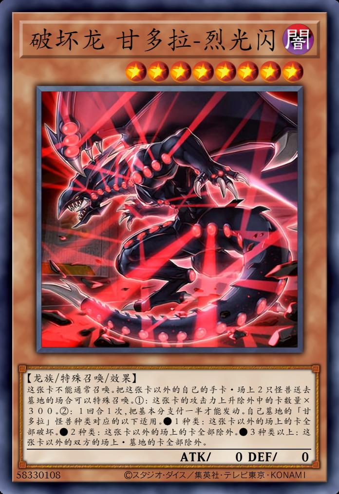 总之依然是1张把“我要FTK”写在脸上的卡牌。并且获取途径非常简单,因为「破坏龙 甘多拉X」在游戏王20周年剧场版中作为表游戏的王牌出场过,所以看电影就能够获得这张特典卡。但是因为其削血的效果过于bug,K社在2025年7月将其列为了禁卡。并且因为有一个优秀的好兄弟还活在外面的缘故,估计此生是要把牢底坐穿。