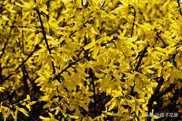 连翘,先花后叶开放,花期3-4月,花开香气淡艳,满枝金黄。