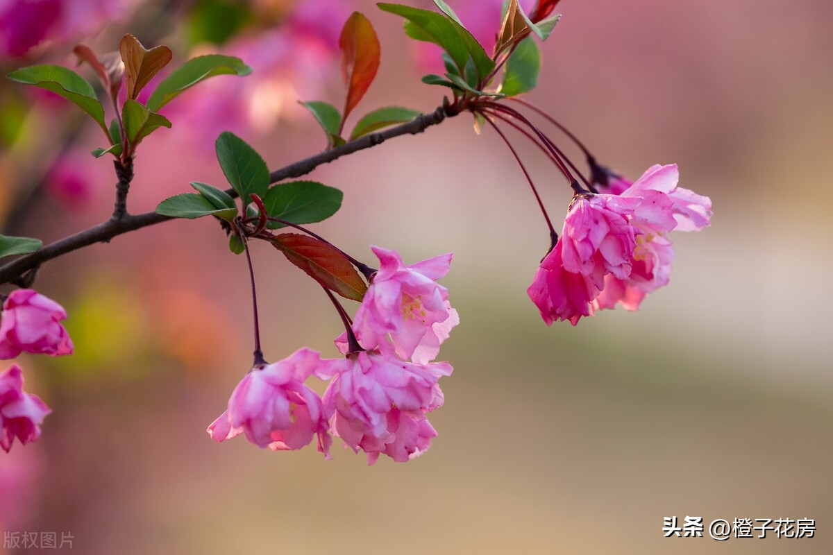 棠品种较多,有西府海棠、垂丝海棠、贴梗海棠、苹果海棠等,海棠开于晚春。