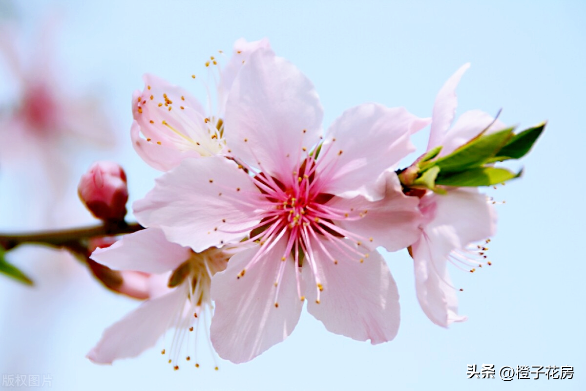 识别要点:桃花单朵开放,花梗短, 花淡粉红色,花瓣顶端尖,花瓣数5枚,花药绯红色,花期在梅花之后。