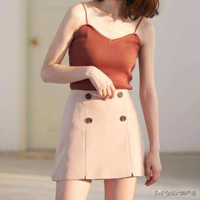 吊带搭配短裙,绝对是非常时髦又性感的搭配方式。夏季很多女孩子都喜欢这样搭配。对于肩宽或者是微胖的女孩子,建议不要这样穿搭。吊带最能凸显出身材的短板,所以微胖女孩慎重。