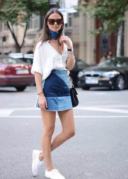 不要选择无袖的T恤来搭配短裙,穿起来有点土气。