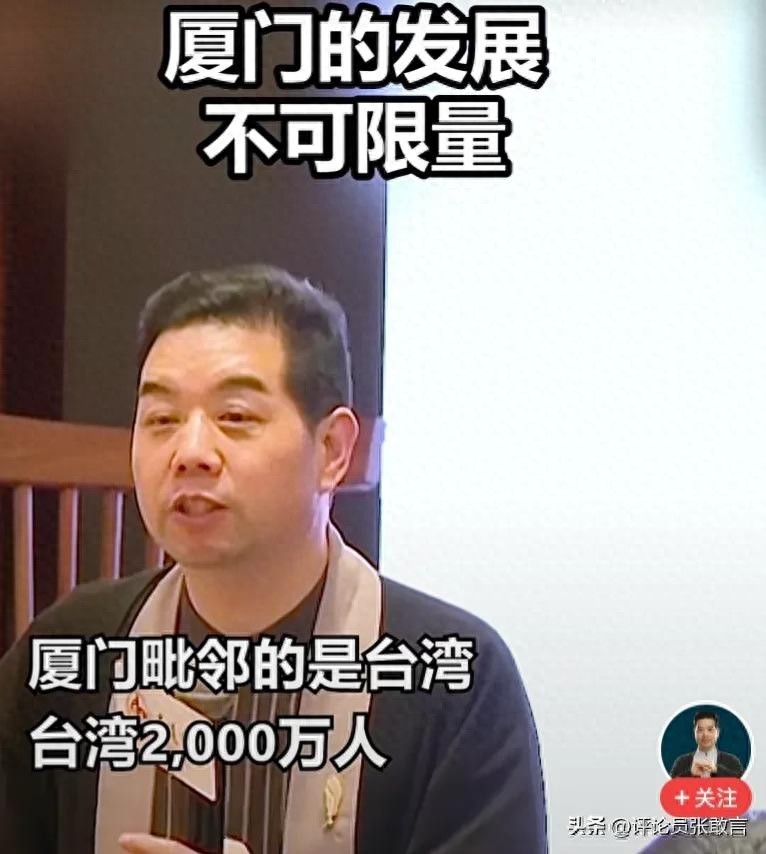 “深圳厉害是因为毗邻香港,香港有800万人;珠海厉害是因为毗邻澳门,但澳门人口少所以发展受限;而厦门发展不可限量,厦门毗邻台湾,台湾有2000多万人口,将来都要经过厦门……”