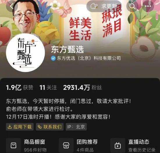 12 月 16 日凌晨,东方甄选抖音官方账号更新签名:东方甄选,今天暂时停播,闭门思过,敬请大家批评!俞老师在带领大家进行检讨。