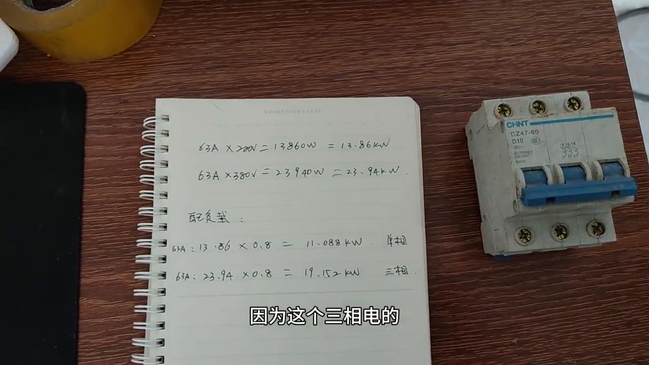 空开是单向的还是三相的?如果三相的就是这种,这是三匹的,三相的。三相的怎么算?63安乘以380伏,因为三相电的是380伏,三相电的就是三相电的,两相的是两相的。63乘以380伏,这三项的最大功率就是23940瓦,也就是23.94千瓦。