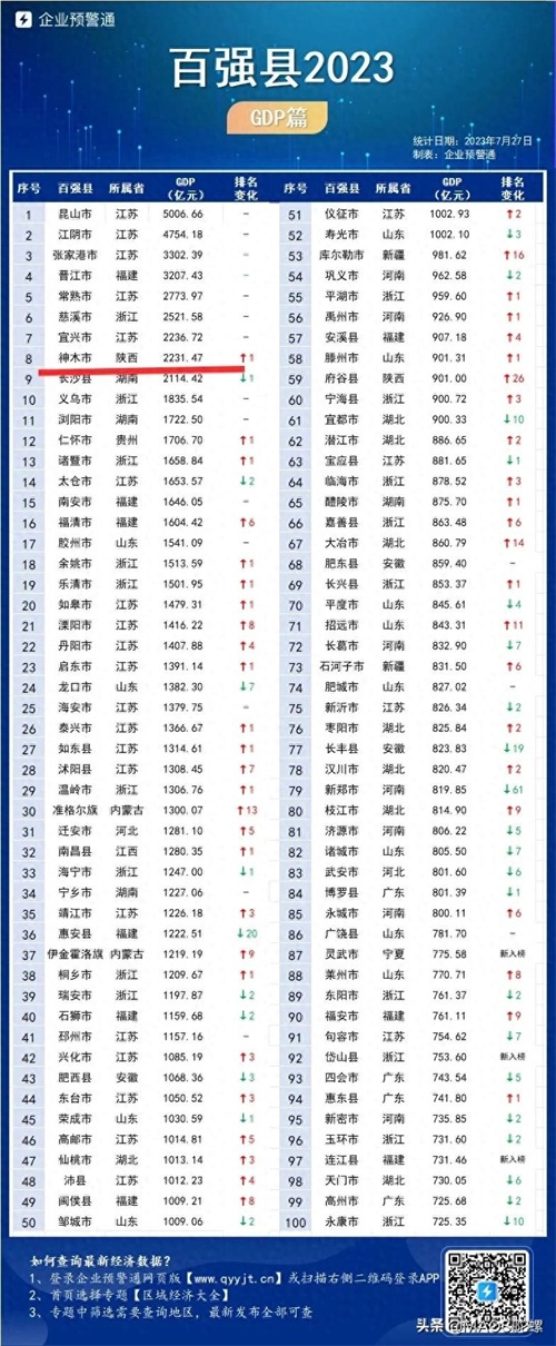 #榆林头条#截至7月27日,最新百强县经济数据已全部披露,部分县级地区在上半年修正了2022年度经济数据。
