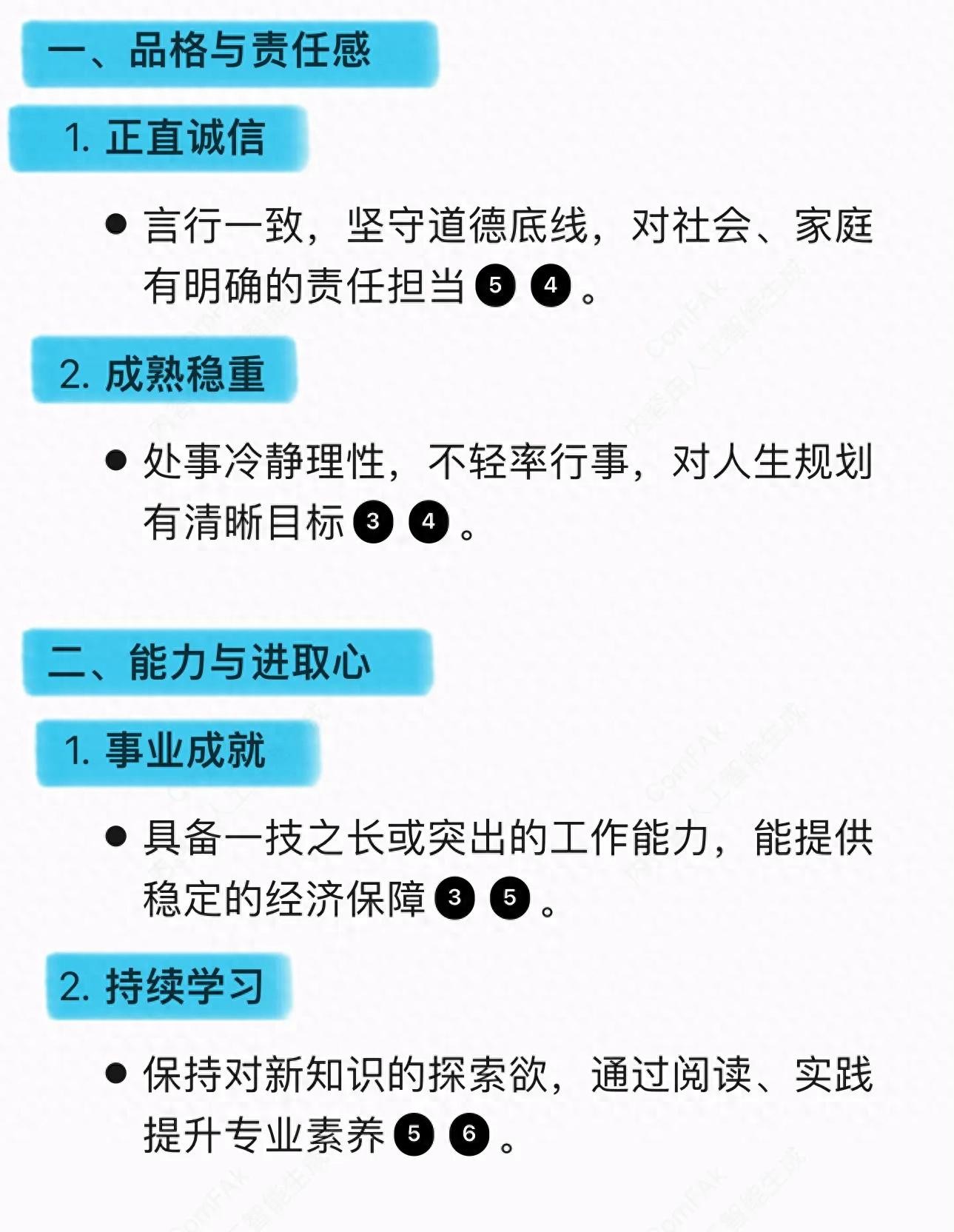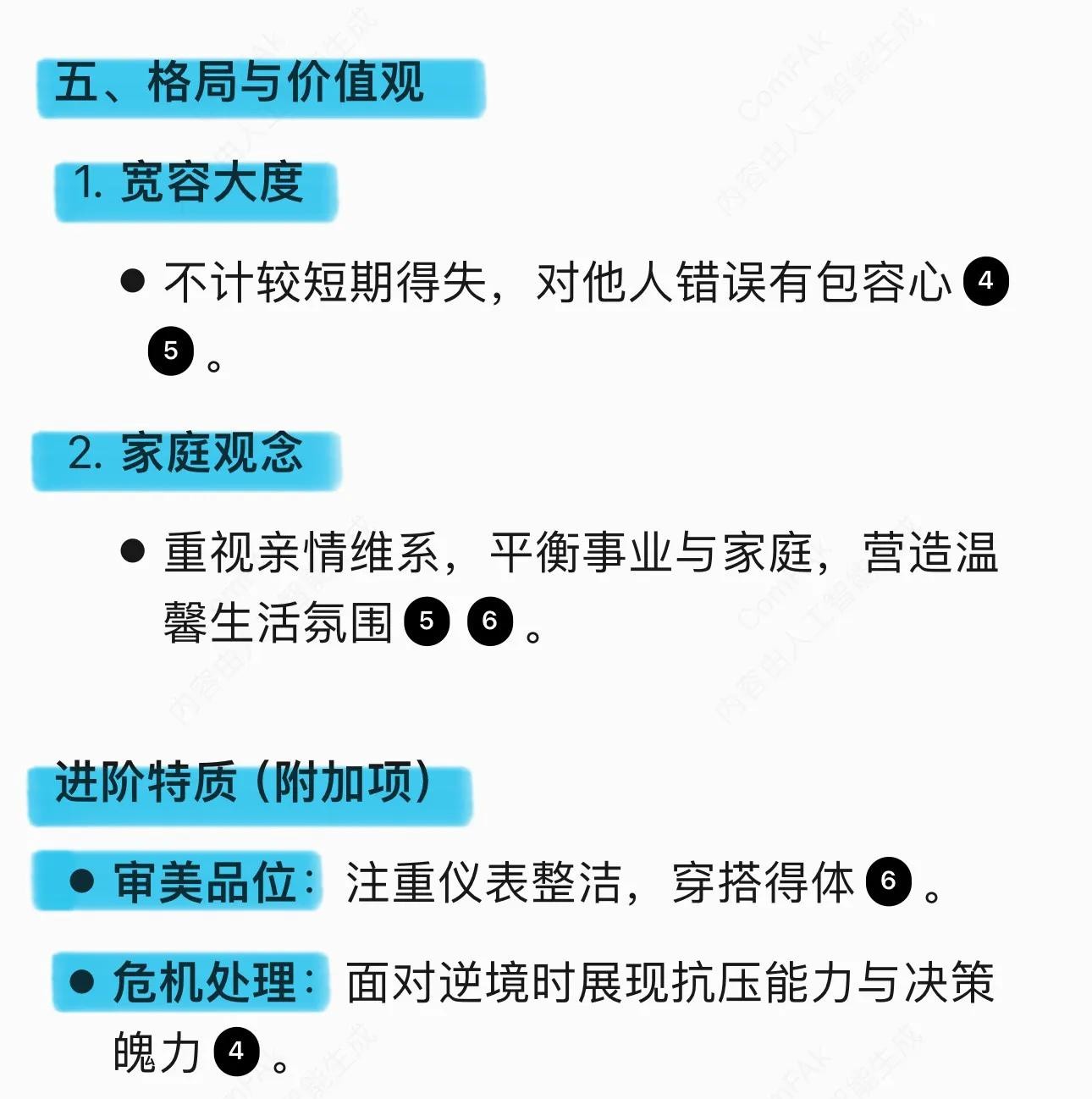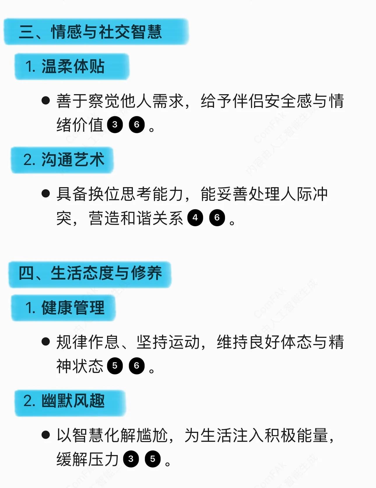 更多细分特征(如面相学中的成功标志、领导力表现等)可参考[[7]()][[6]()]中的深度解析。优质男性的核心在于「内外兼修」,既需物质能力支撑,更需精神境界引领。