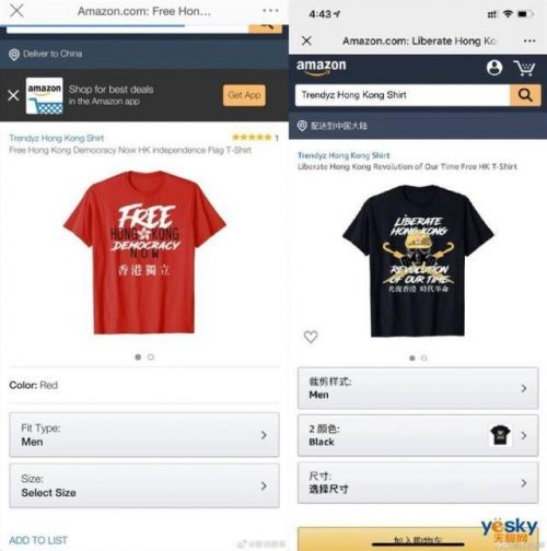 8月14日消息,据网友截图显示,亚马逊在其平台上公然售卖港独衣服。衣服上印有英文:“FREE HONG KONG DEMOCRACY NOW;中文:香港独立。”亚马逊此举无疑是惹众怒,“亚马逊T恤”很快上了微博热搜。截至发稿前,亚马逊方面尚未对此进行回应。