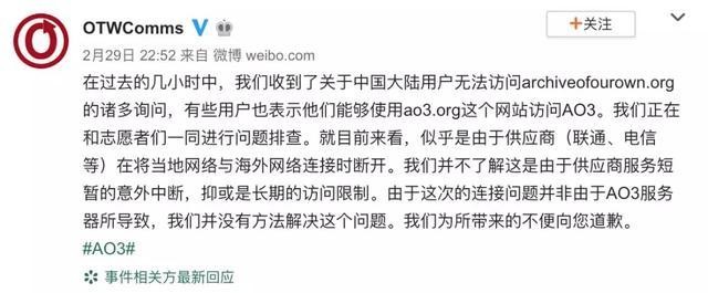 可能是这篇作品确实非常吸引人,传播到了肖战的一些粉丝的眼里,这些粉丝认为它 “ 侮辱 ” 了自家偶像。于是乎这批粉丝反手一个举报送了上去 —— 由于 AO3 网站的创作自由度非常高,举报作品是没有用的,因此决定举报整个网站。于是 2 月 27 日,肖战粉丝在微博上和其他人也开始了大战,这就有了前面提到的 “ 227 事件 ” 。在 2 月 29 日,AO3 被封了。