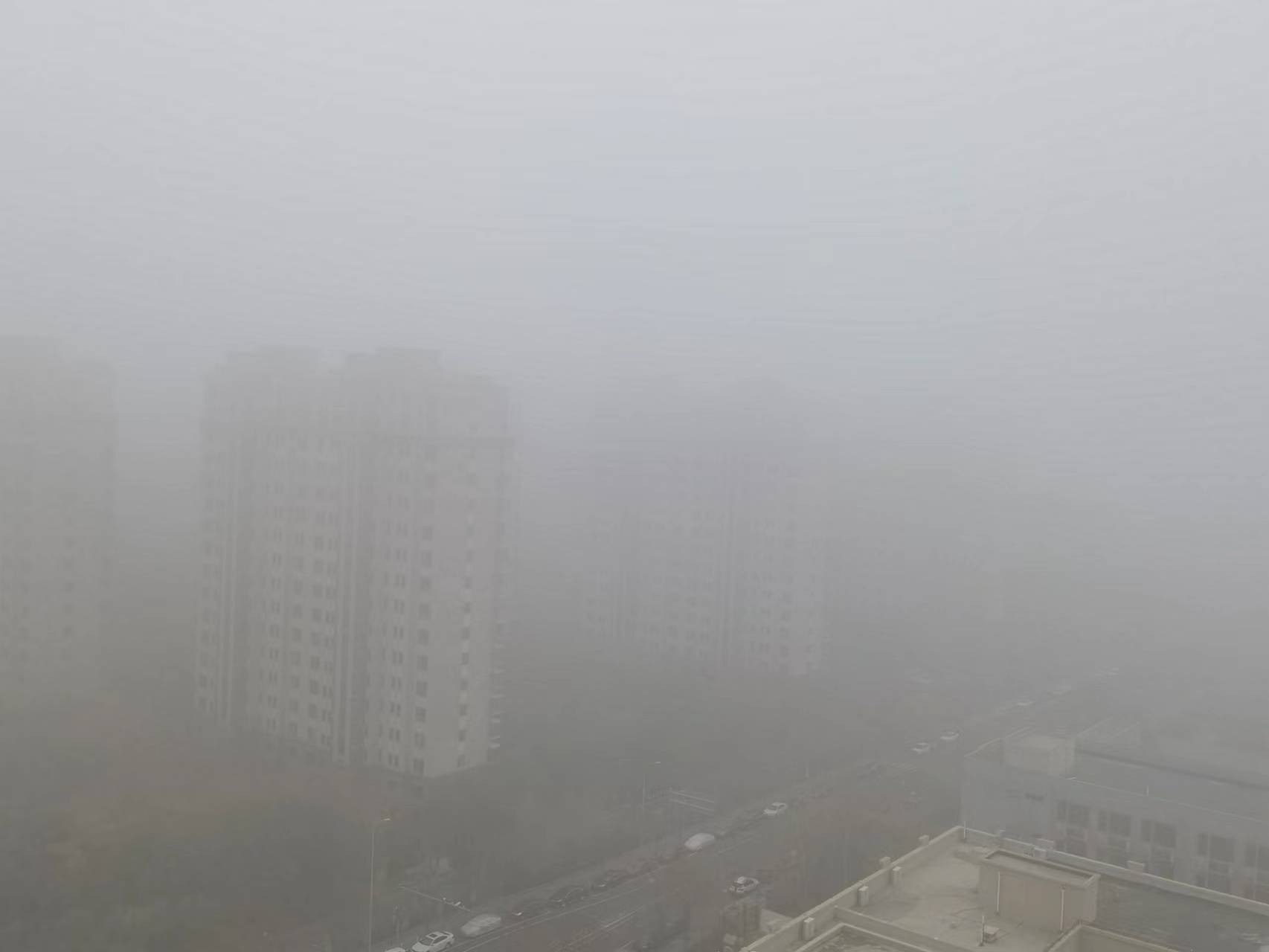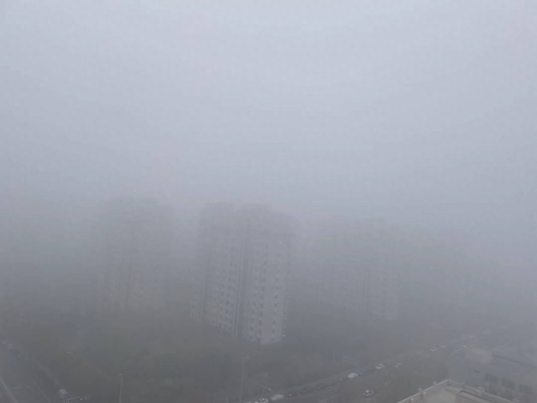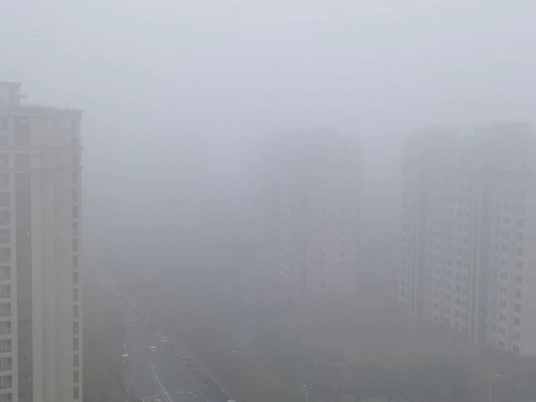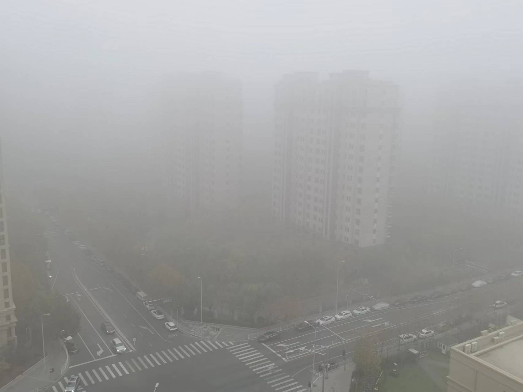 11月20日下午16时许,重污染天气下的北京亦庄新城,从居民楼上远眺,雾气弥漫,能见度很低,几十米外的楼宇都模糊不清。