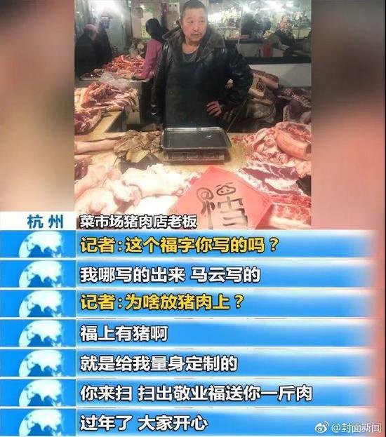 该福字很快走俏,出现在菜市场。一名猪肉店老板贴出了马云的福字,表示扫此福得“敬业福”就赠猪肉一斤。