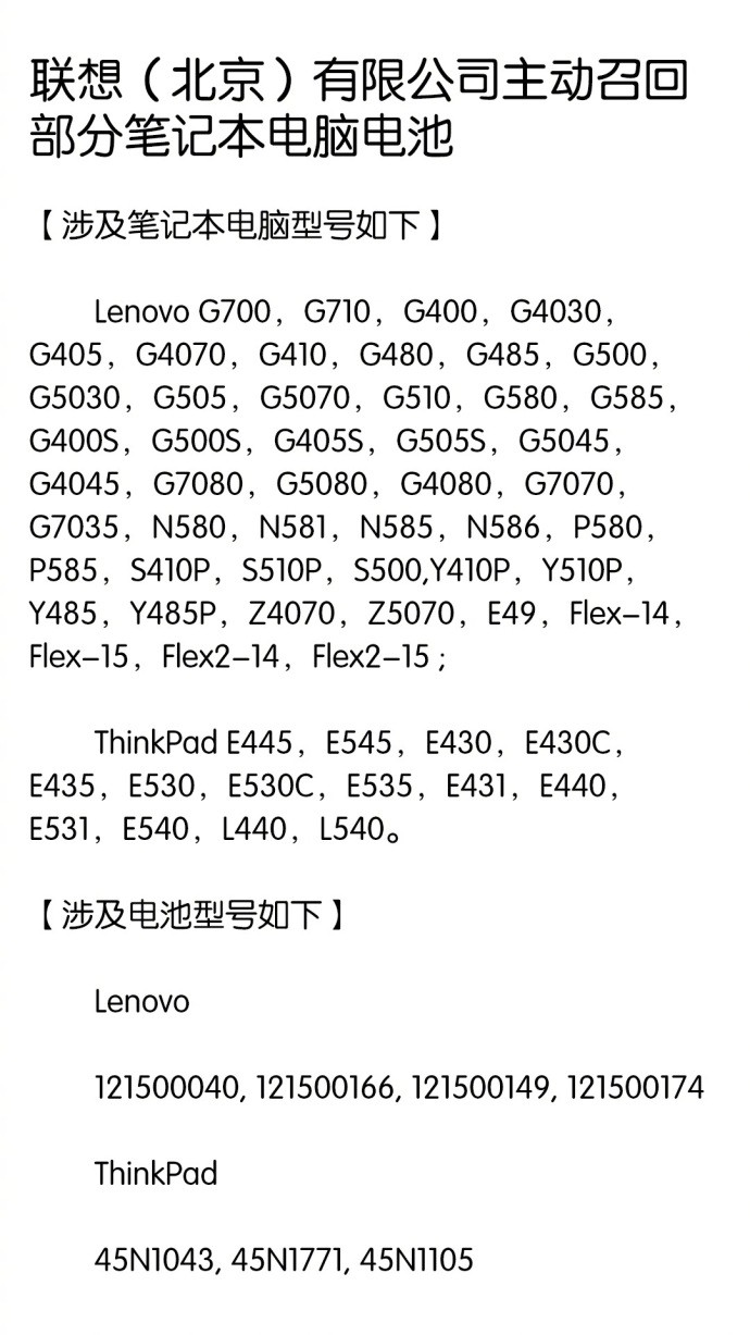 召回!这些联想笔记本电池,极端情况可能引发起火!