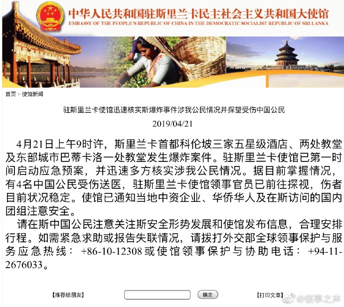 外交部领事保护中心官方微博@领事之声 21日发布通告:请在斯中国公民注意安全,如需紧急求助或报告失联情况,请拨打使馆领事保护与协助电话:+94-11-2676033,或拨打外交部全球领事保护与服务应急热线+86-10-12308。