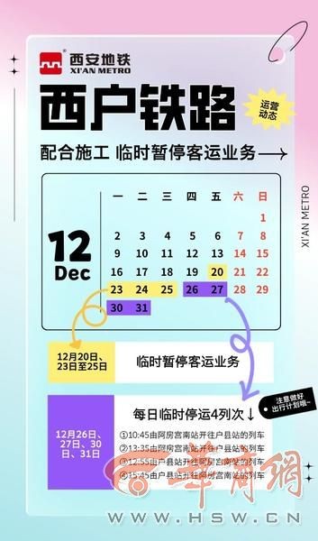 据悉,为配合大寨路西段(绕城高速-富源四路)市政工程涉西户铁路施工,西户铁路将于12月20日、23日、24日、25日暂停客运服务;同时,将于12月26日、27日、30日、31日每日停运4列次(分别为10:45、13:35由阿房宫南站开往户县站的列车,12:55、15:45由户县站开往阿房宫南站的列车)。请市民乘客提前做好出行规划。