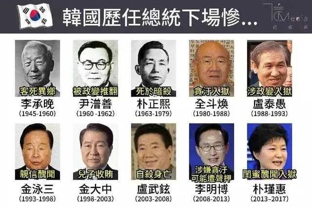 这些财阀不仅掌控了社会方方面面也在左右着韩国政坛,不仅各“掌门人”成了法外狂徒,韩国总统也成了当今世界最危险的职业之一,韩国过去的12位总统中首任李承晚流亡夏威夷、第二任伊普善被政变推翻、第三任朴正熙被刺杀、第四任崔圭夏被政变推翻、第五任全斗焕下台后被抄家、第六任卢泰愚下台后被判17年、第七任金泳三下台后入狱、第八任金大中善终、第九任卢武铉跳崖身亡、第十任李明博被判17年、第十一任朴槿惠被弹劾入狱判25年(被特赦)、第十二任文在寅目前还没有出事。总统当到这份上的也就非洲大区可以与之媲美了,这种现象也被称作青瓦台魔咒。