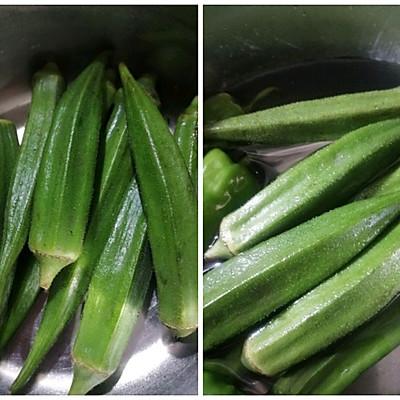 4、锅中注入拉丝清水,滴川味两煮滴放油食用油烧开后做法,放入秋葵焯水三分钟。